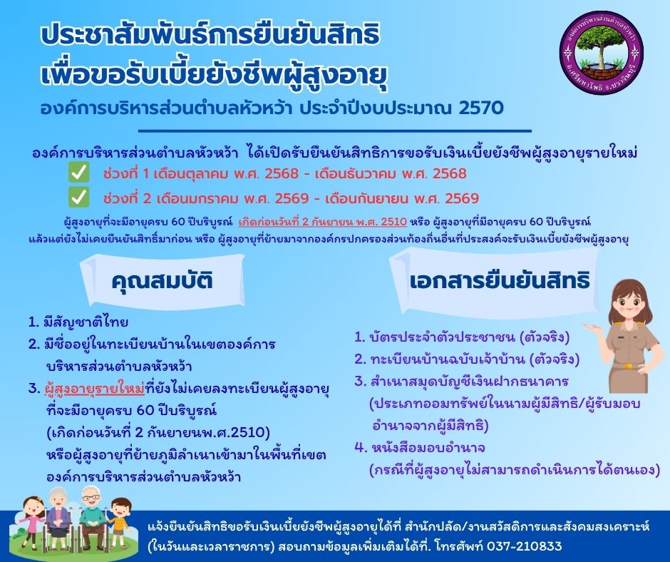 ประชาสัมพันธ์การยืนยันสิทธิเพื่อขอรับเบี้ยยังชีพผู้สูงอายุ องค์การบริหารส่วนตำบลหัวหว้า ประจำปีงบประมาณ 2570