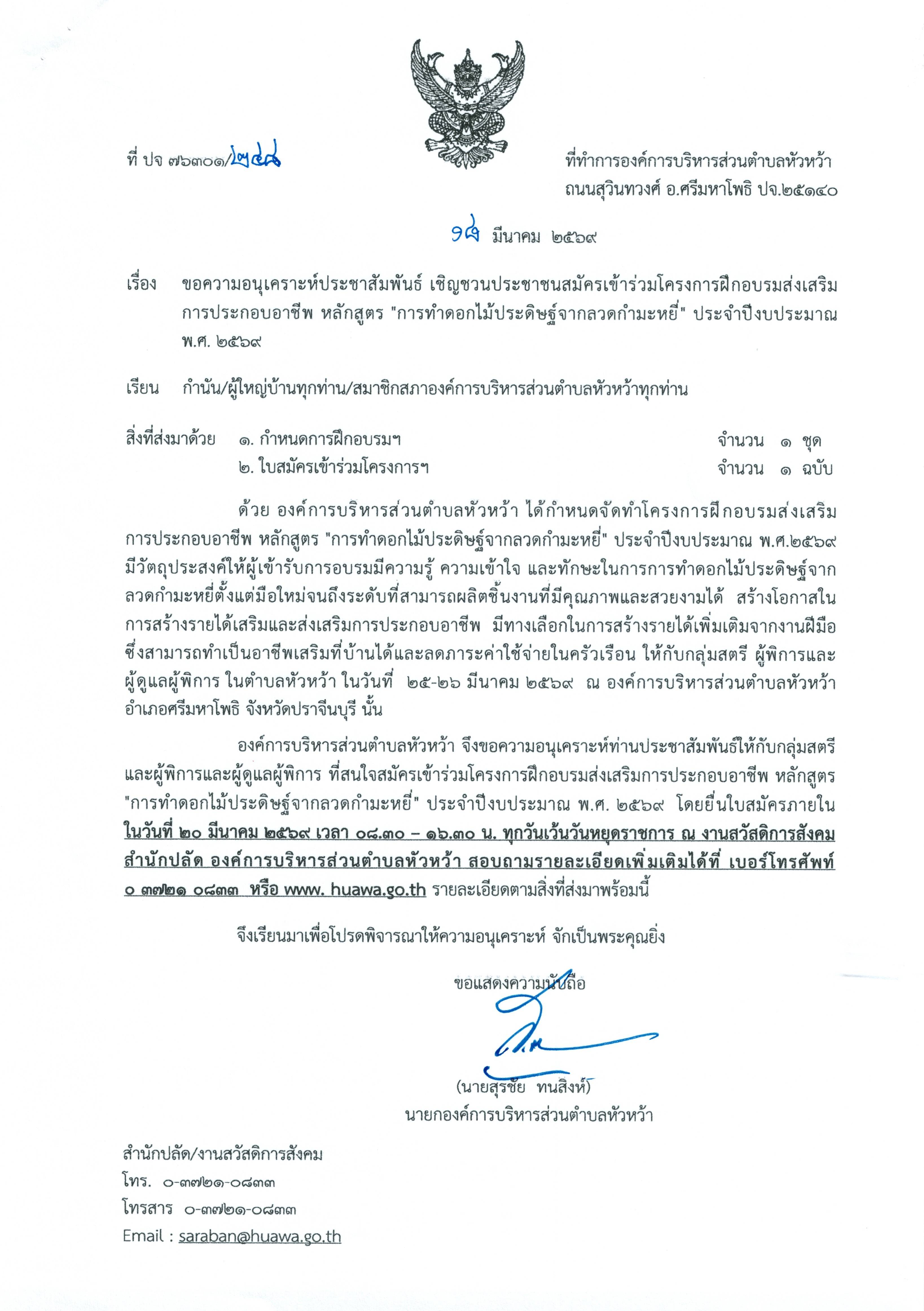 ประกาศองค์การบริหารส่วนตำบลหัวหว้า เรื่อง รับสมัครผู้สูงอายุในพื้นที่ตำบลหัวหว้าเข้าร่วมโครงการส่งเสริมคุณภาพชีวิตผุ้สูงอายุ ประจำปีงบประมาณ พ.ศ.2569